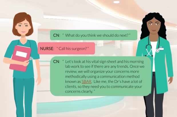 Task: Give nursing students a practice scenario to interaction with doctor staff and patient. Students were giving vitals and patient records to interaction with. Nursing students can use their knowledge to answer questions and practice skills in a hospital environment. Worked with SME’s to ensure accuracy of content and create objectives of nursing course..